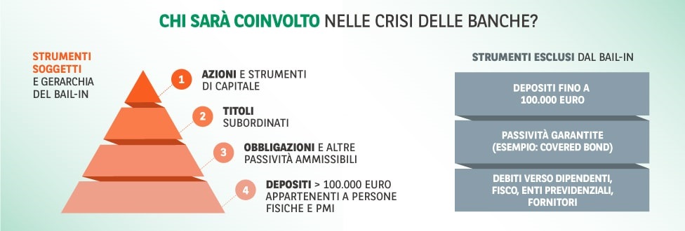 Il principio base del bail-in è che chi possiede strumenti finanziari più rischiosi contribuisca maggiormente al risanamento nel caso di crisi bancaria. Gli azionisti saranno quindi i primi ad essere chiamati ad intervenire. Se il loro contributo dovesse rivelarsi insufficiente, dovranno contribuire coloro che possiedono altre categorie di strumenti, secondo il seguente schema di priorità: