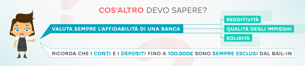 È bene ricordare che in nessun caso i depositi e i conti correnti fino a 100.000 euro possono essere coinvolti nelle procedure di salvataggio interno delle banche. Inoltre, la garanzia del Fondo Interbancario di Tutela dei Depositi e dal Fondo di Garanzia dei Depositanti del Credito Cooperativo è stabilita per ogni singolo depositante e per banca.